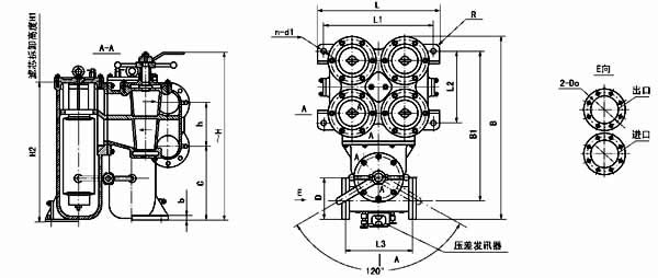 法蘭標準:GB573-65(可根據需要確定):DN100、150-3 組濾芯組件 DN200-4 組濾芯組件;壓差發訊器為選配件。